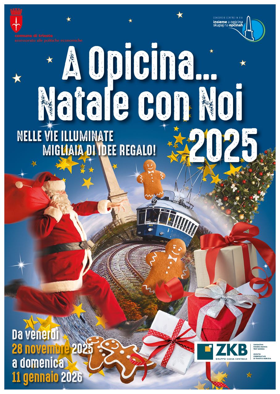 Anche quest’anno a Opicina si festeggia il “A Opicina... Natale con noi. Il programma prevede anche nel 2025, oltre alla consueta apertura straordinaria dei negozi, l’allestimento di ben quattro presepi: a Villa Carsia, in Via di Prosecco, al Laghetto di Percedol e – dall’anno scorso – anche all’Obelisco. E poi San Nicolò e Babbo Natale in carrozza, mercatino natalizio e di San Nicolò, feste e saggi di Natale, Pickleball, mostre, intrattenimento per i più piccoli, visite ai Bunker di Opicina e alla Kleine Berlin e l’apertura straordinaria domenicale dei negozi (il 7, 14 e 21 dicembre dalle ore 9.30 alle ore 13.00 e dalle ore 15.30 alle ore 19.00). La manifestazione ravviverà la borgata carsica con le luci e i colori del Natale dal 28 novembre 2025 fino all’11 gennaio 2026.