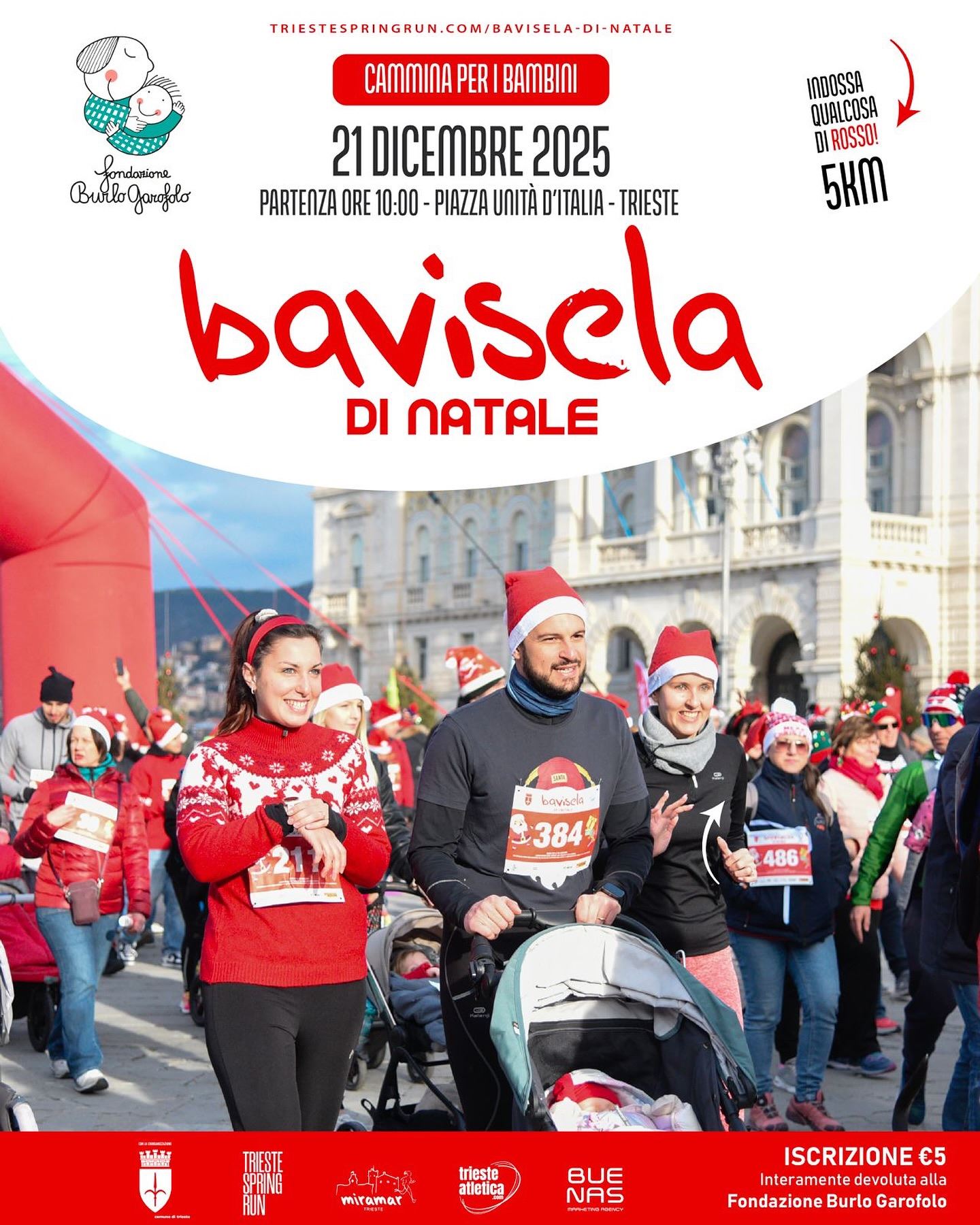Sabato 21 dicembre, alle ore 10, da Piazza Unità d’Italia parte la Bavisela di Natale, la camminata benefica interamente a favore della Fondazione Burlo Garofolo.