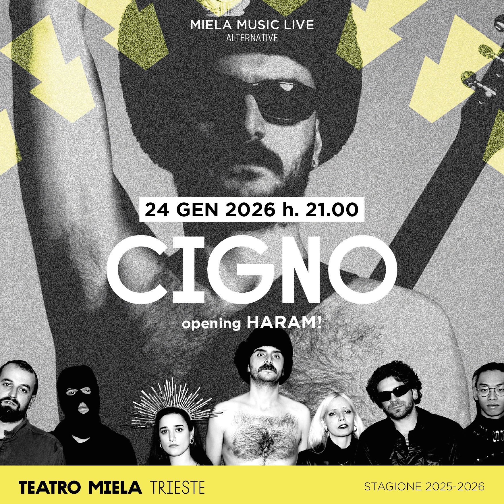 Sabato 24 gennaio alle ore 21.00 al Mela, per la rassegna Miela Music Live Alternative, Cigno con la corrida apocalittica e ossessionante, il ritualismo eversivo del pensiero postmoderno, le estinzioni e resurrezioni. Liturgia elettrificata delle nostre nostalgie musicali e politiche: spoken poetry, deragliamenti post-punk, annegamenti techno.