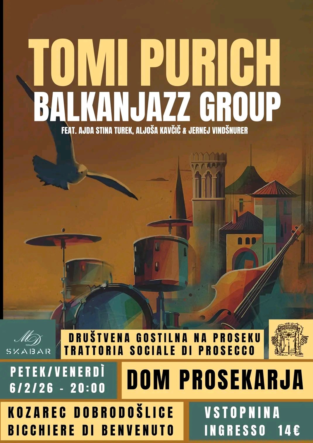 Venerdì 6 febbraio alle 20.00 si terrà alla Casa del Prosekar (Dom Prosekarja) un concerto di musica etno-balkan-jazz. Il batterista Tomi Purich si esibirà con il suo BalkanJazz Group affiancato dalla cantante Ajda Stina Turek , dal contrabbassista Jernej Vindšnurer e da Aljoša Kavčič al pianoforte.
