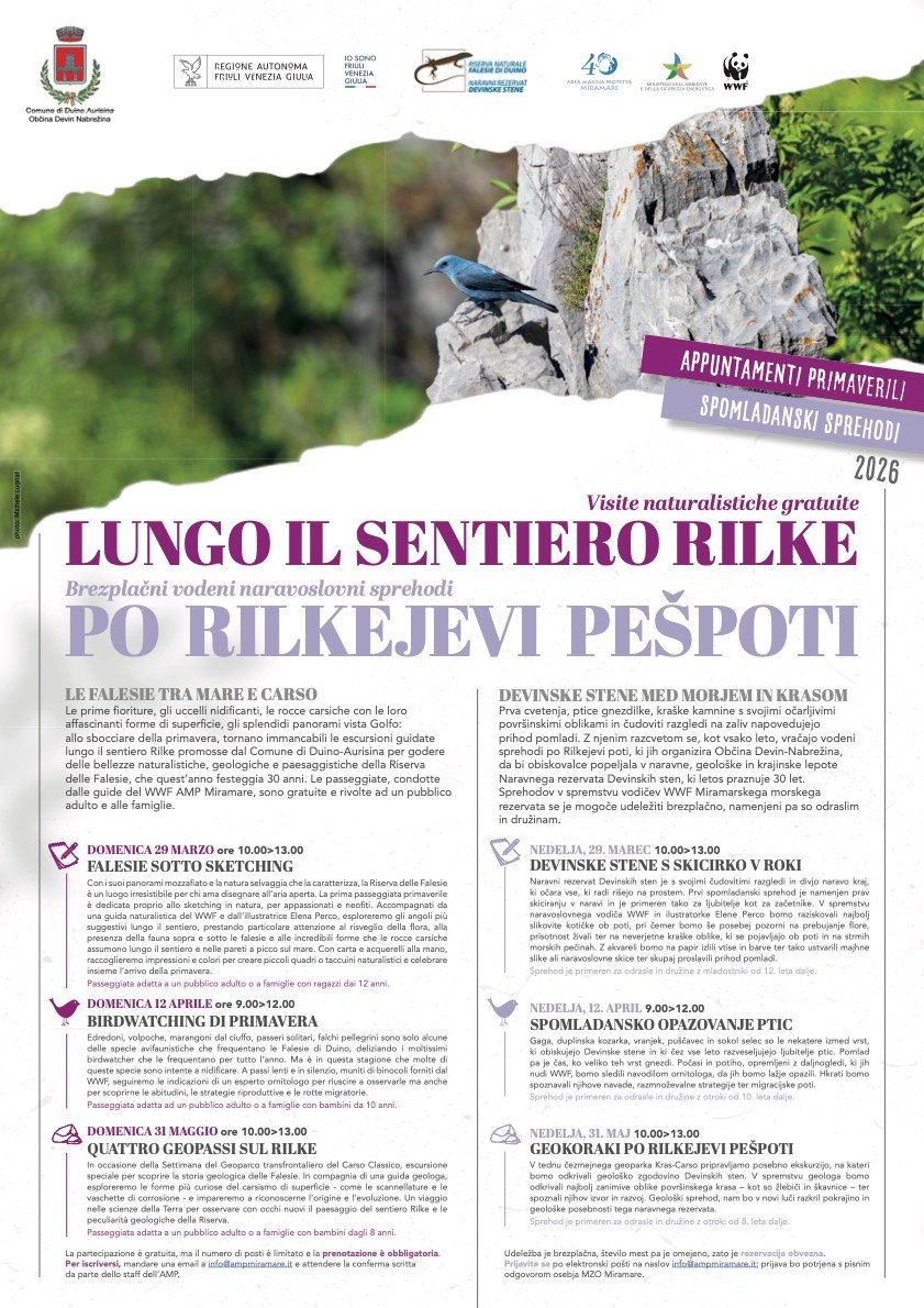 Con il mese di marzo prende il via il consueto calendario di passeggiate guidate sul sentiero Rilke, promosse dal Comune di Duino-Aurisina e condotte dallo staff WWF dell’AMP Miramare per far conoscere il patrimonio naturalistico e geologico della Riserva delle Falesie di Duino, che nel 2026 raggiunge il traguardo dei 30 anni di istituzione.