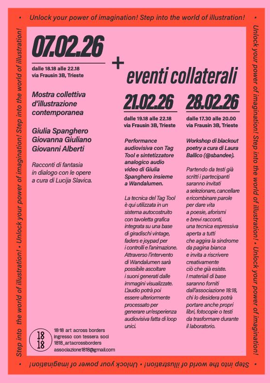 Dal 7 febbraio al 7 marzo 2026, l’Associazione 18:18 presenta in via Frausin 3/b “Geniali Girotondi Grafici”, mostra collettiva di illustrazione contemporanea che riunisce i lavori di Giulia Spanghero, Giovanna Giuliano e Giovanni Alberti. Il progetto espositivo propone un confronto aperto sul potere creativo delle immagini e sulla loro capacità di creare connessioni. L’inaugurazione è prevista il 7 febbraio alle ore 18:18; la rassegna artistica resterà aperta fino a sabato 7 marzo e sarà visitabile il giovedì e il venerdì dalle 17 alle 19, oppure su appuntamento scrivendo a associazione1818@gmail.com.