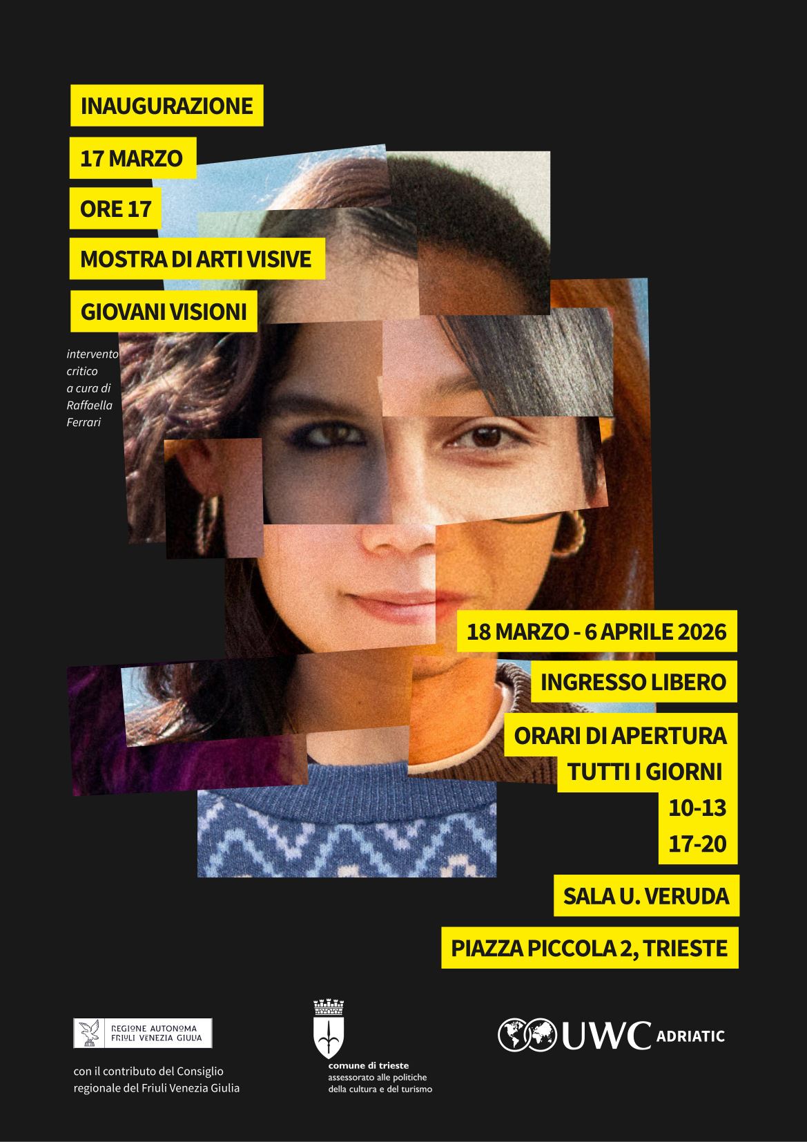 Il Collegio del Mondo Unito dell’Adriatico ONLUS, in collaborazione con il Comune di Trieste, presenta la mostra “Giovani Visioni. Mostra di Arti Visive degli studenti del Collegio del Mondo Unito dell’Adriatico” che raccoglie i progetti finali di Arti Visive di 15 studenti che stanno completando il loro percorso formativo a Duino.