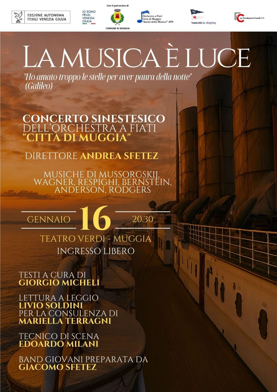 Approda a Muggia “La Musica è Luce”, progetto musical-teatrale che prevede un ciclo di otto concerti a ingresso libero (tranne quello al teatro Miela di Trieste dell’ 8 febbraio, dov’è prevista la partecipazione straordinaria di Alesio Colautti) in sette località regionali da gennaio ad aprile 2026. Il prossimo spettacolo si terrà venerdì 16 gennaio alle ore 20.30 al teatro Verdi di Muggia con ingresso libero.