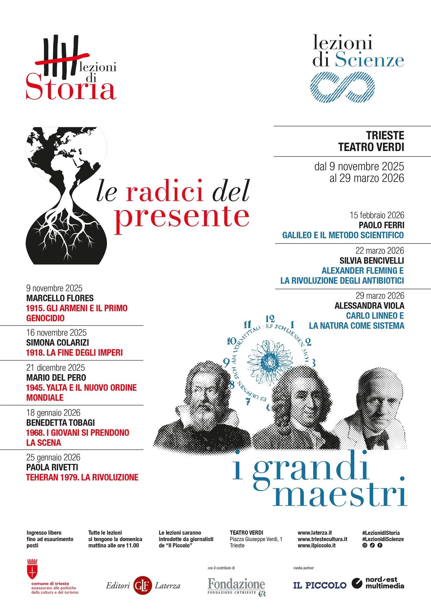Lezioni di Storia a Trieste: Le radici del presente è il titolo del nuovo ciclo di Lezioni in cinque appuntamenti, che si terranno al Teatro Verdi a partire dal 9 novembre 2025.