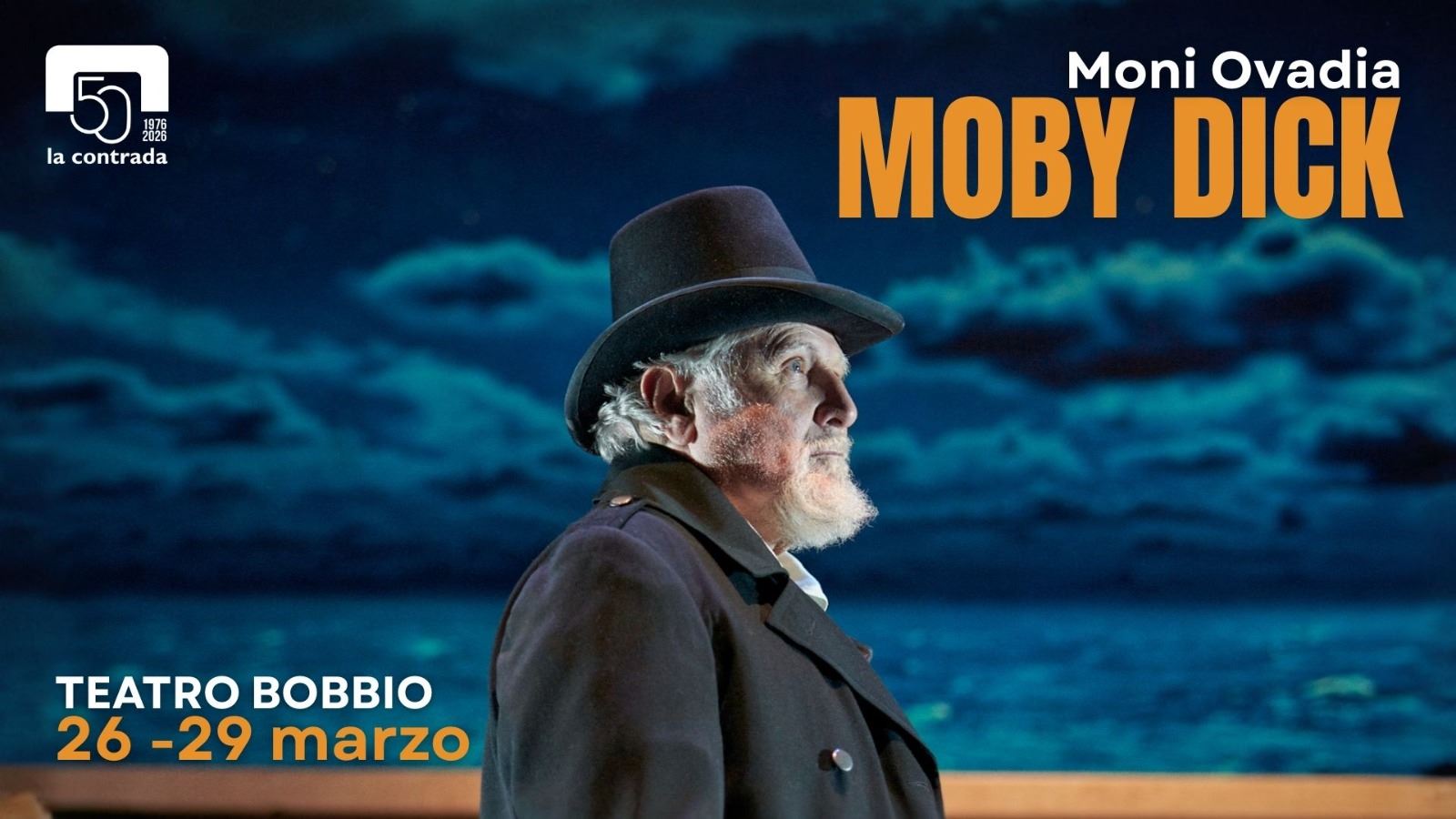 Il palcoscenico del Teatro Bobbio di Trieste dal 26 al 29 marzo si trasforma nel ponte del Pequod, il vascello maledetto su cui si consuma la famosa lotta tra l'uomo e l'abisso. In questa imponente produzione firmata dal Centro Teatrale Bresciano insieme al Teatro Quirino e alla Compagnia Molière, il capolavoro di Herman Melville, MOBY DICK, rivive nell'adattamento di Micaela Miano, trovando in Moni Ovadia un interprete magnetico per la figura del Capitano Achab. La regia di Guglielmo Ferro orchestra un’esperienza unica dove la narrazione teatrale abbandona ogni porto sicuro per avventurarsi nei territori della tragedia shakespeariana, trasformando la caccia alla balena bianca in una discesa agli inferi della coscienza umana.