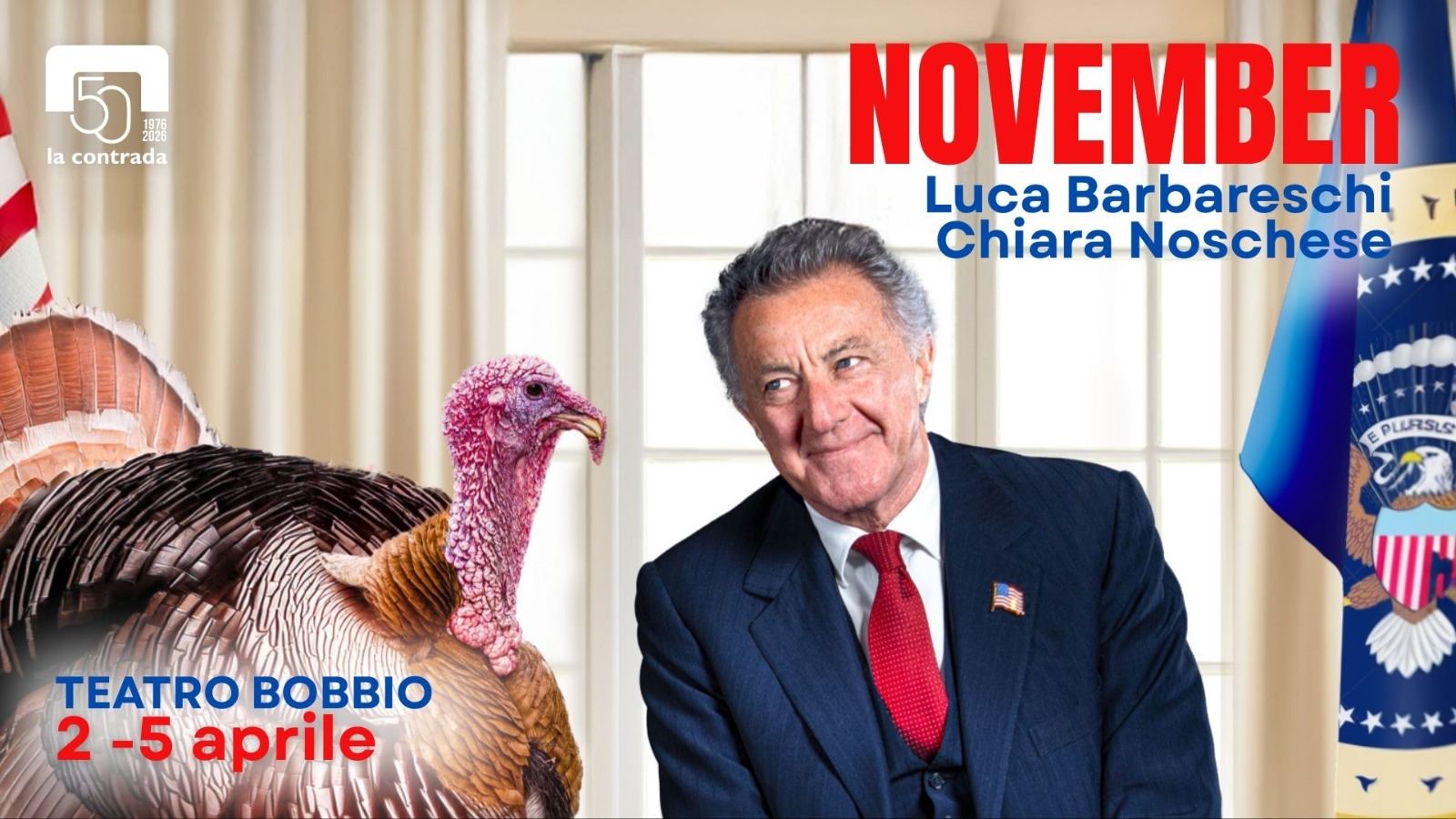Il sipario del Teatro Bobbio si alza su una delle commedie più affilate e politicamente scorrette della drammaturgia contemporanea. Dal 2 al 5 aprile 2026, la Contrada ospita "November", il capolavoro satirico di David Mamet che vede protagonisti Luca Barbareschi, Simone Colombari e Chiara Noschese, quest'ultima impegnata anche nella raffinata regia dello spettacolo. Un'inarrestabile macchina comica tra crisi e tacchini.