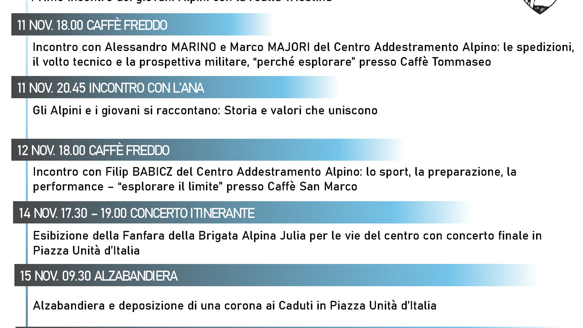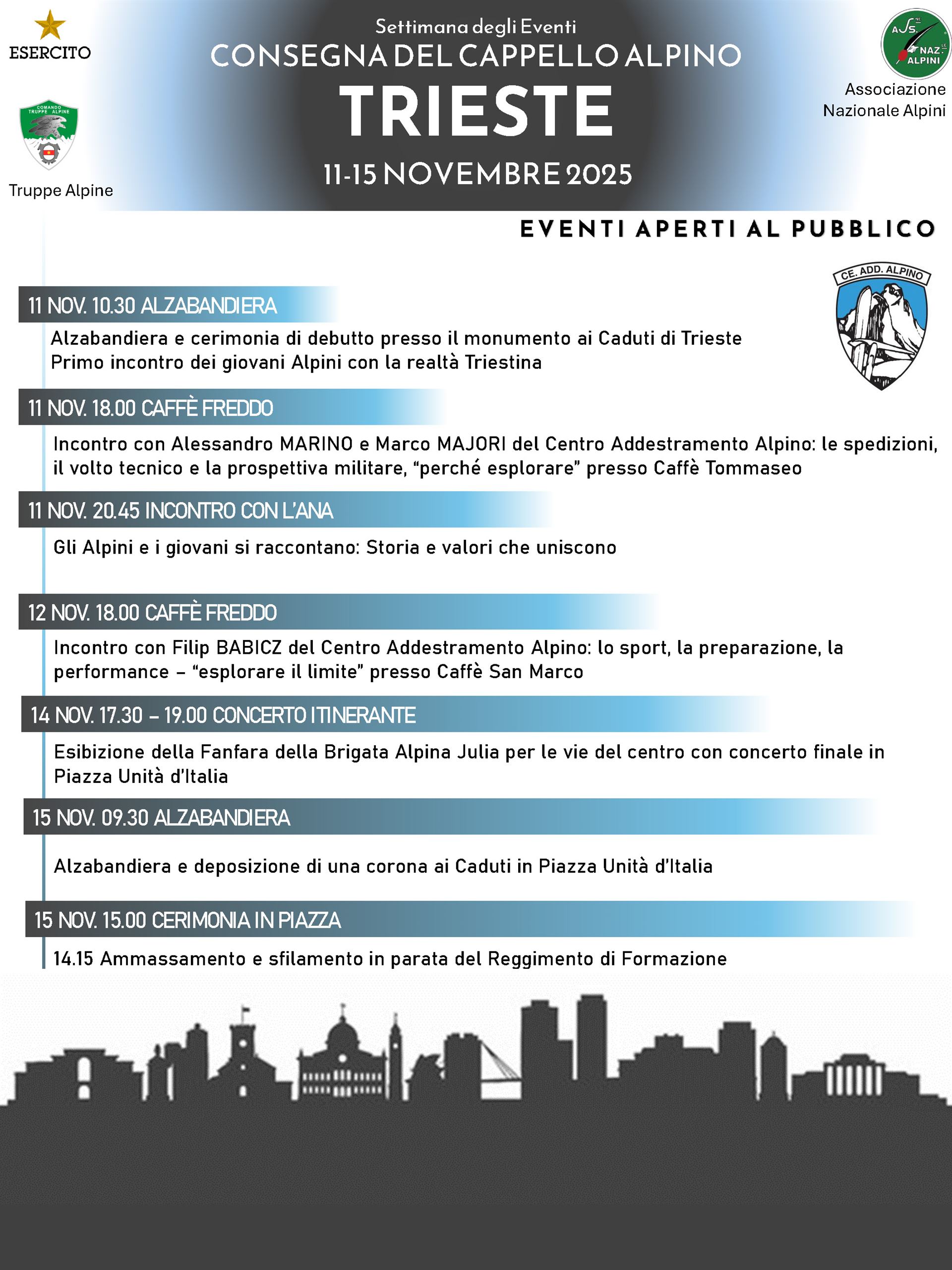 Dal 10 al 15 novembre Trieste sarà protagonista di una serie di eventi culturali e formativi che culmineranno sabato 15 novembre alle ore 15, in piazza Unita d’Italia con la cerimonia solenne di consegna del cappello con la penna ai giovani Volontari in Ferma Iniziale che hanno concluso la formazione iniziale in montagna presso il Centro Addestramento Alpino di Aosta.