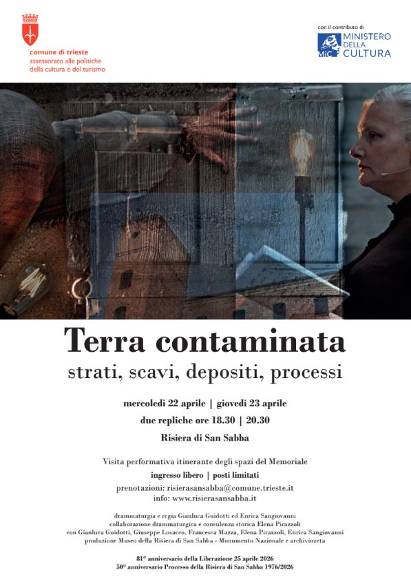 Terra contaminata è stata scritta appositamente per la Risiera di San Sabba dagli attori e registi Enrica Sangiovanni e Gianluca Guidotti di archiviozeta, con la consulenza storica di Elena Pirazzoli, ricercatrice indipendente esperta di memoriali e cultura visiva della memoria. Saranno in scena, negli spazi monumentali della Risiera, Gianluca Guidotti, Giuseppe Losacco, Elena Pirazzoli, Enrica Sangiovanni e Francesca Mazza, tre volte Premio Ubu come migliore attrice.